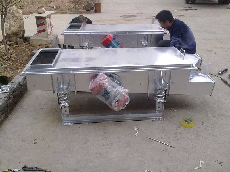 多層粉料直線振動(dòng)篩為雙振動(dòng)電機(jī)驅(qū)動(dòng),利用振動(dòng)電機(jī)激振的原理工作。當(dāng)兩臺(tái)電機(jī)作同步、反向旋轉(zhuǎn)時(shí),其偏心塊所產(chǎn)生的振動(dòng)力在平行于電機(jī)軸線的方向相互抵消,在振動(dòng)力和物料自重力的聯(lián)合作用下,使物料在篩面上被拋起跳躍式向前作直線運(yùn)動(dòng),以合理匹配篩網(wǎng)達(dá)到篩分的目的。